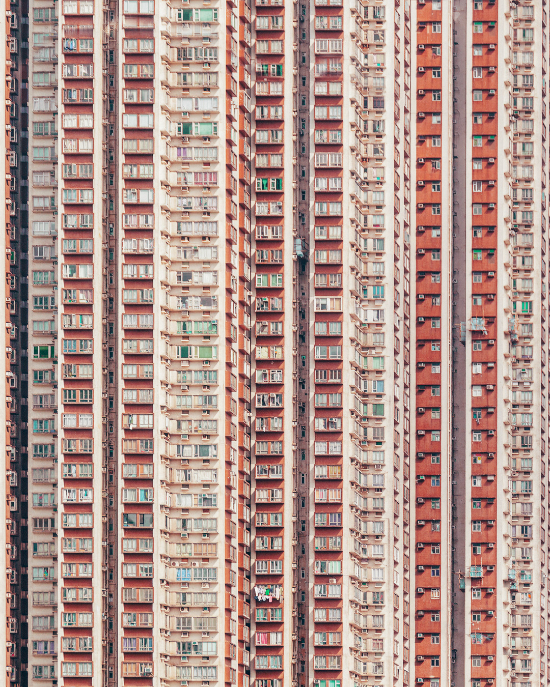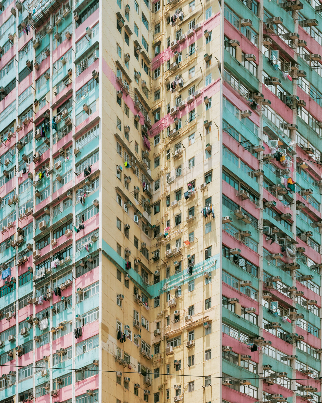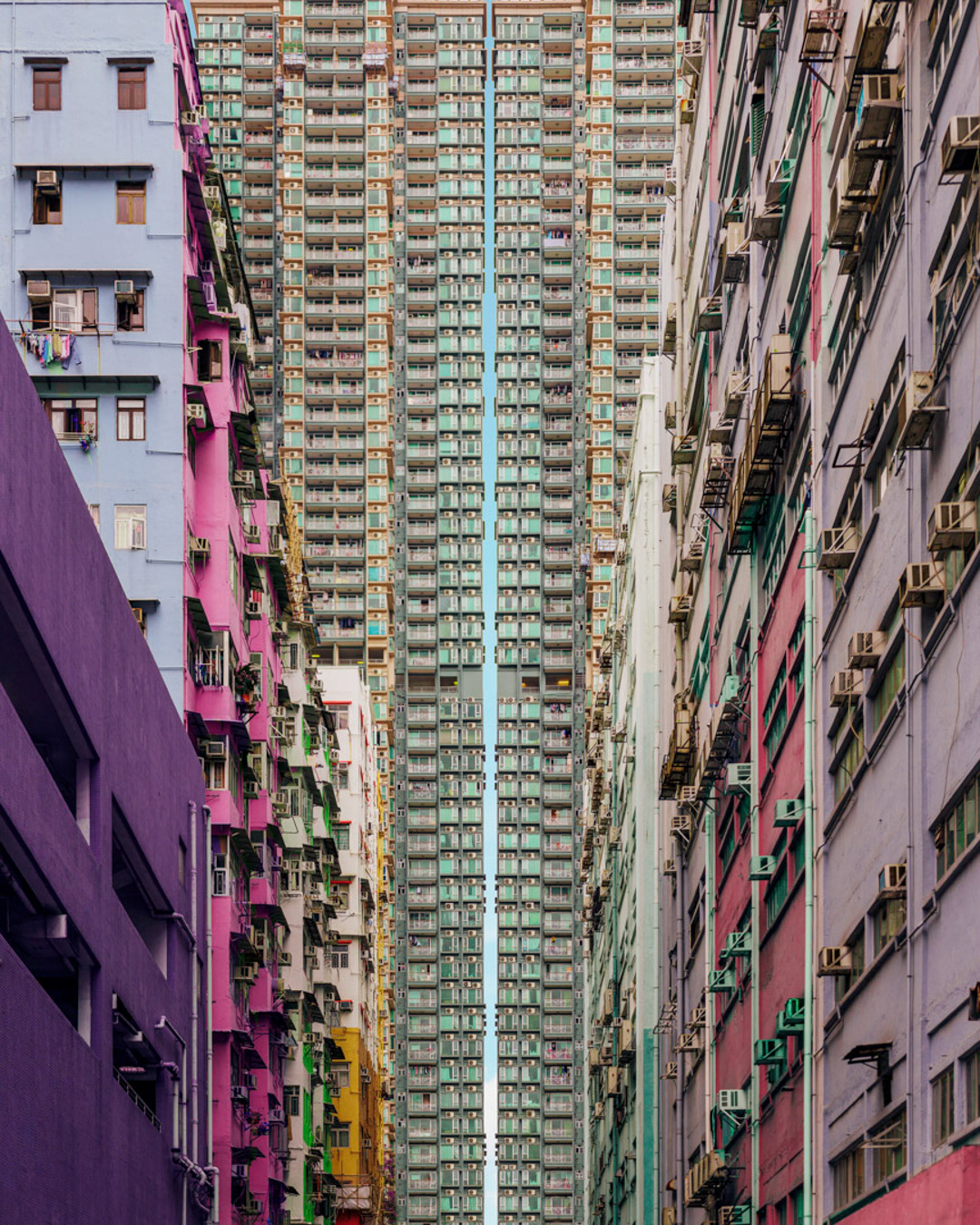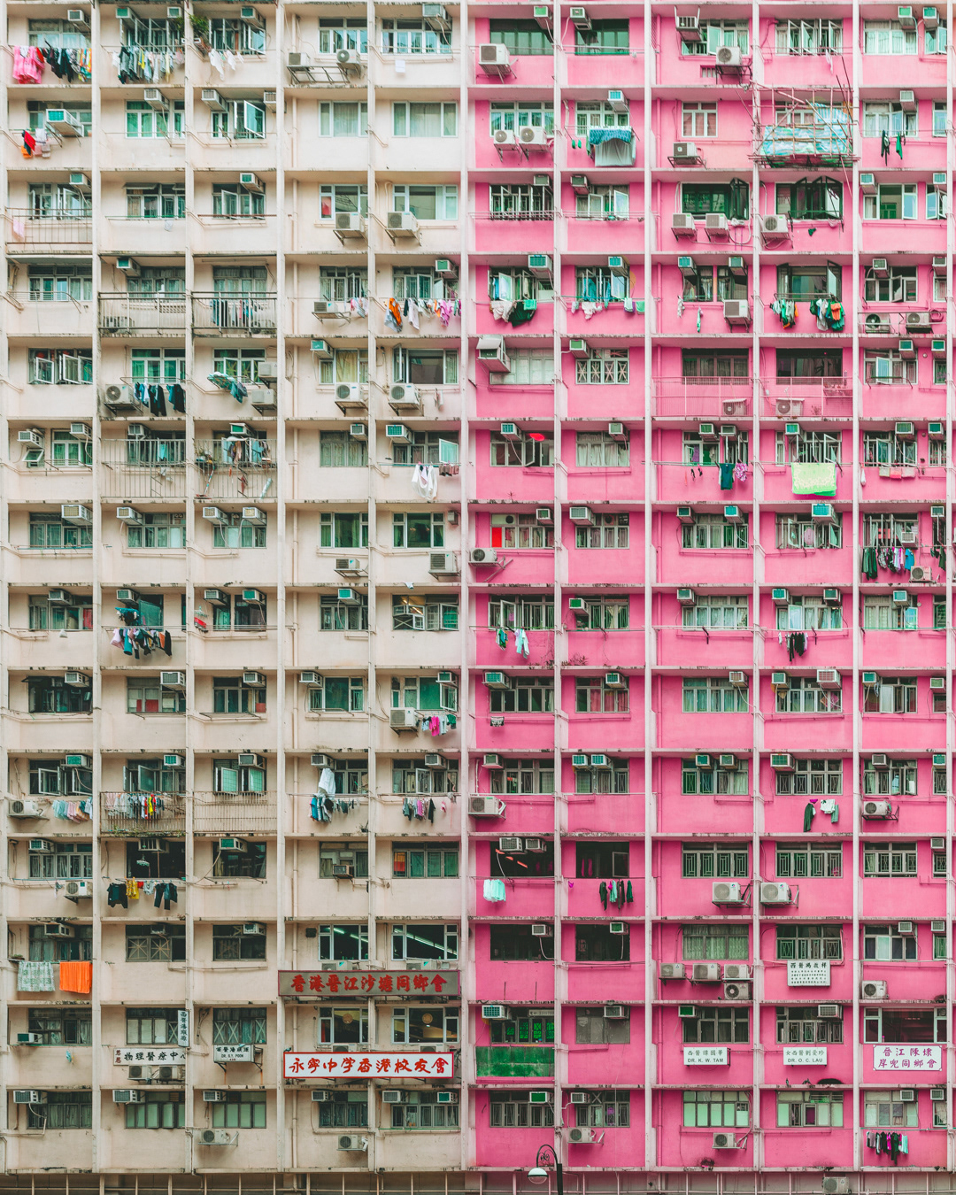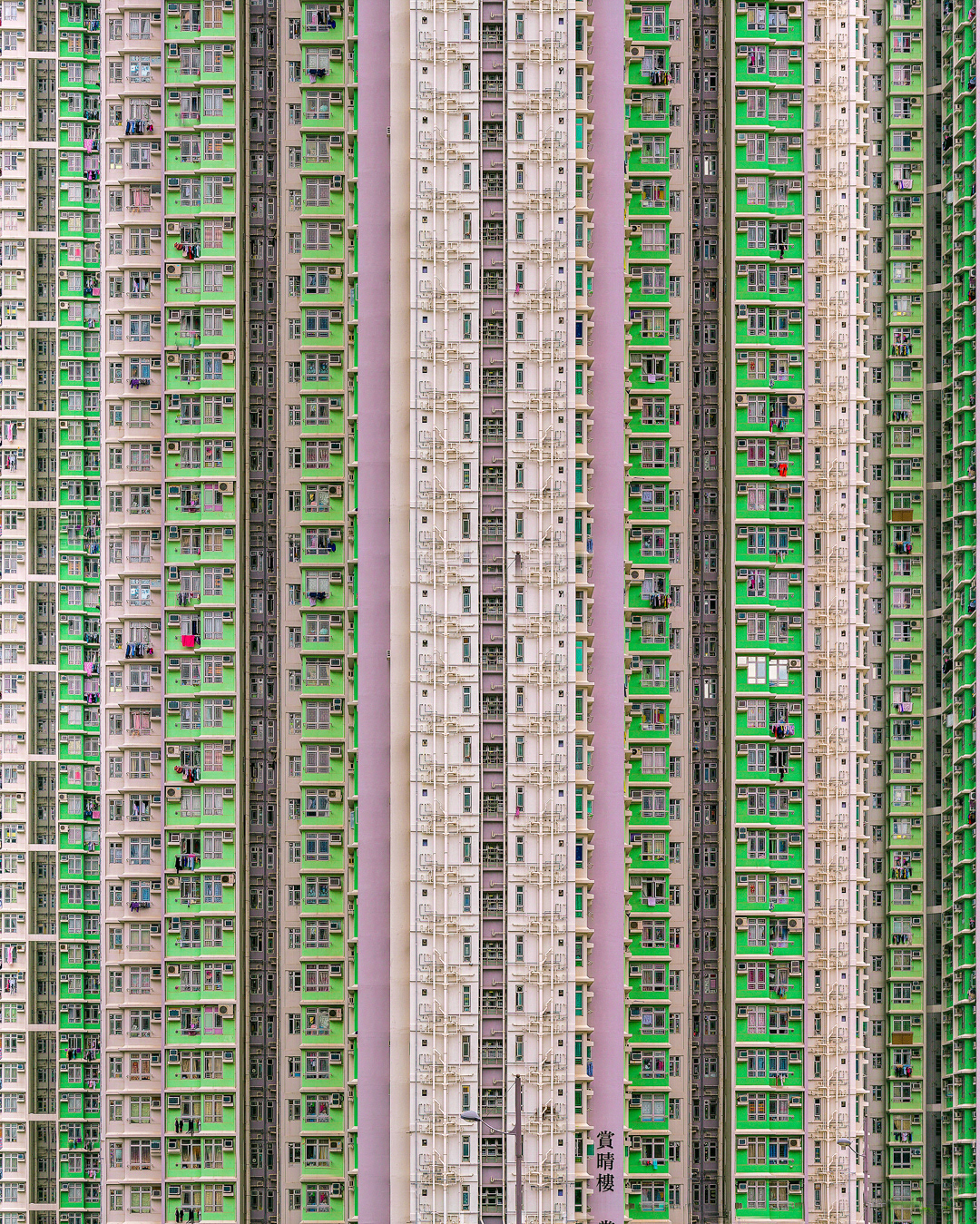 The vibrant, chaotic beauty of Hong Kong’s busy facades—dense layers of signage, air conditioners, laundry, and life stacked high across towering buildings. Each image reveals the city’s unique vertical rhythm, where urban density meets visual overload in a dynamic expression of daily life and architectural adaptation.