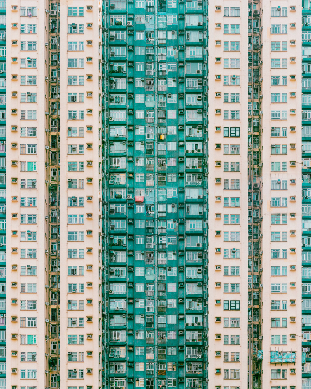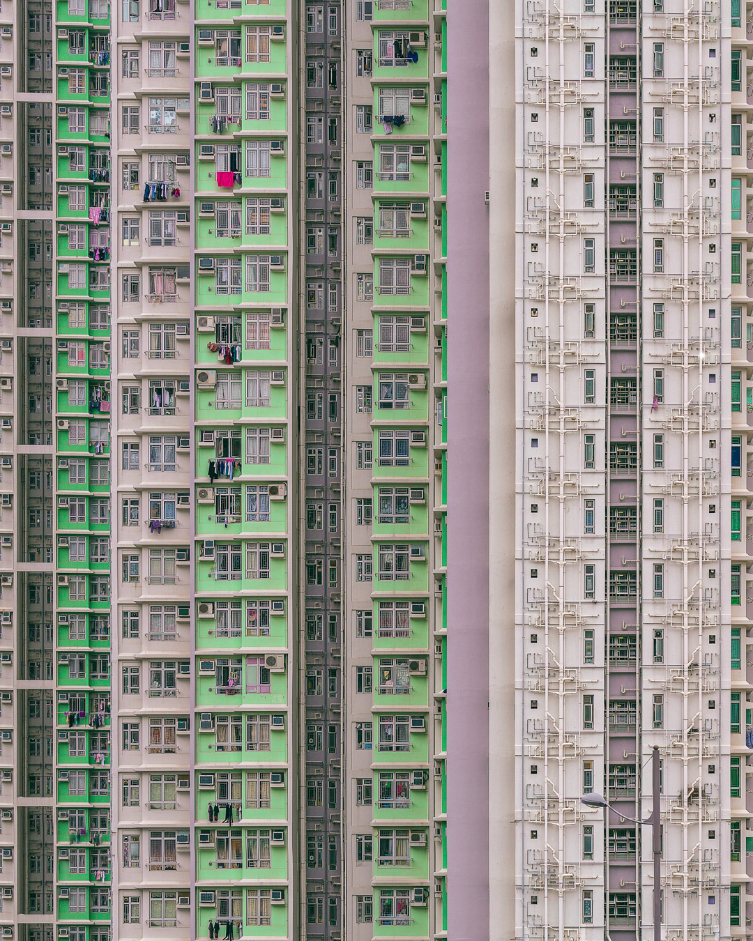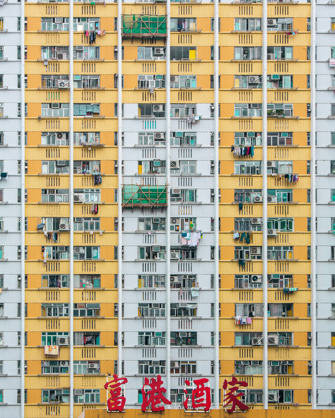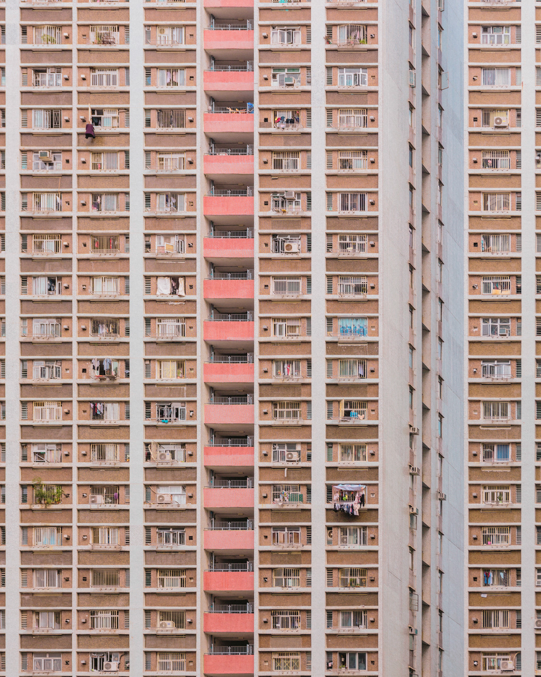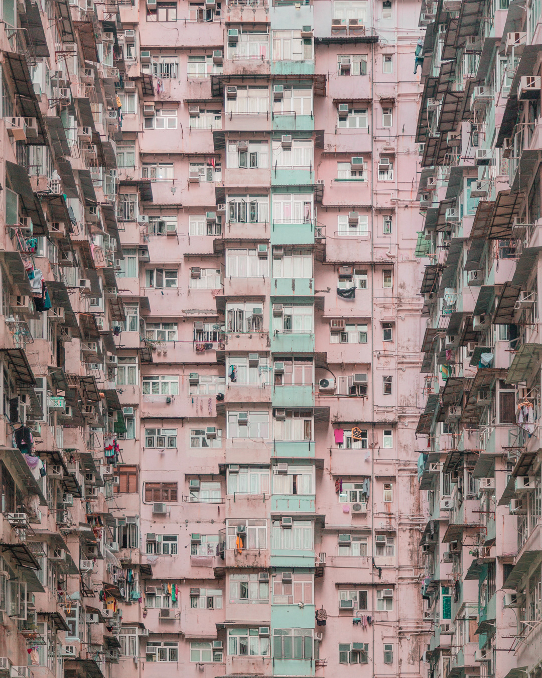 The vibrant, chaotic beauty of Hong Kong’s busy facades—dense layers of signage, air conditioners, laundry, and life stacked high across towering buildings. Each image reveals the city’s unique vertical rhythm, where urban density meets visual overload in a dynamic expression of daily life and architectural adaptation.