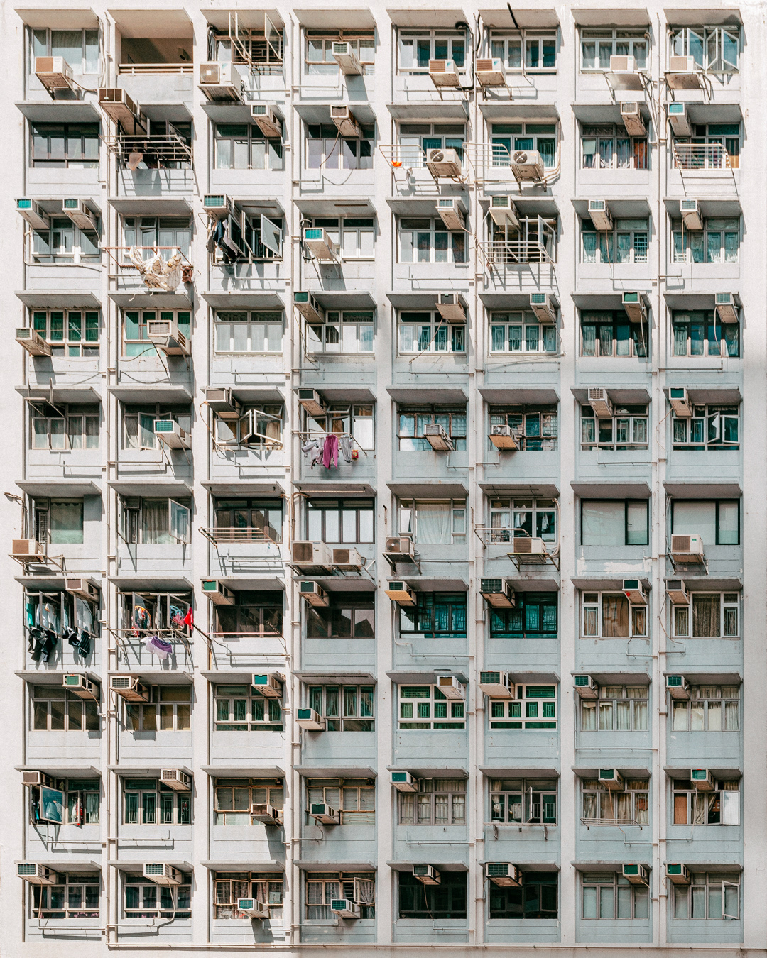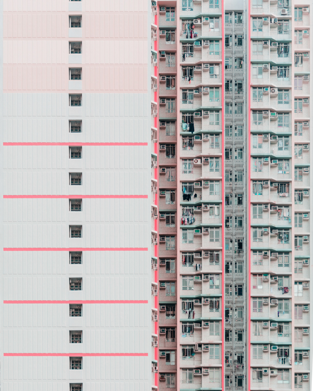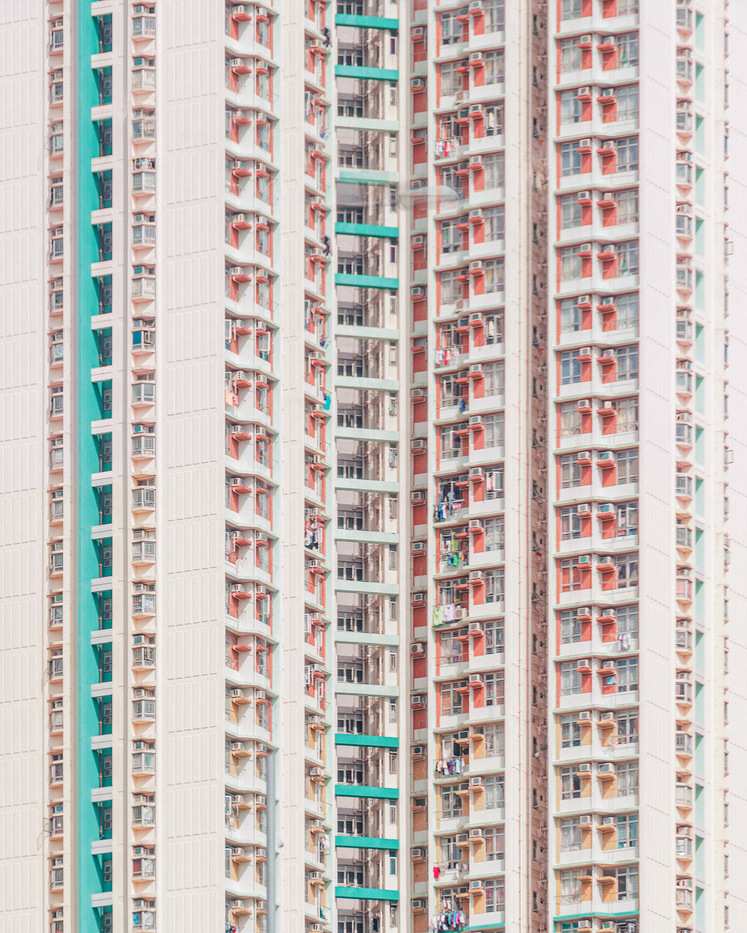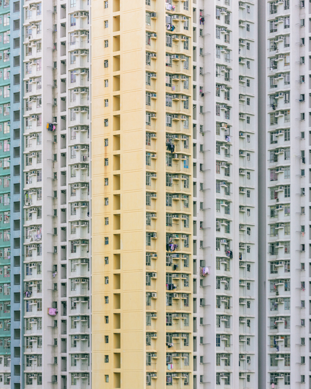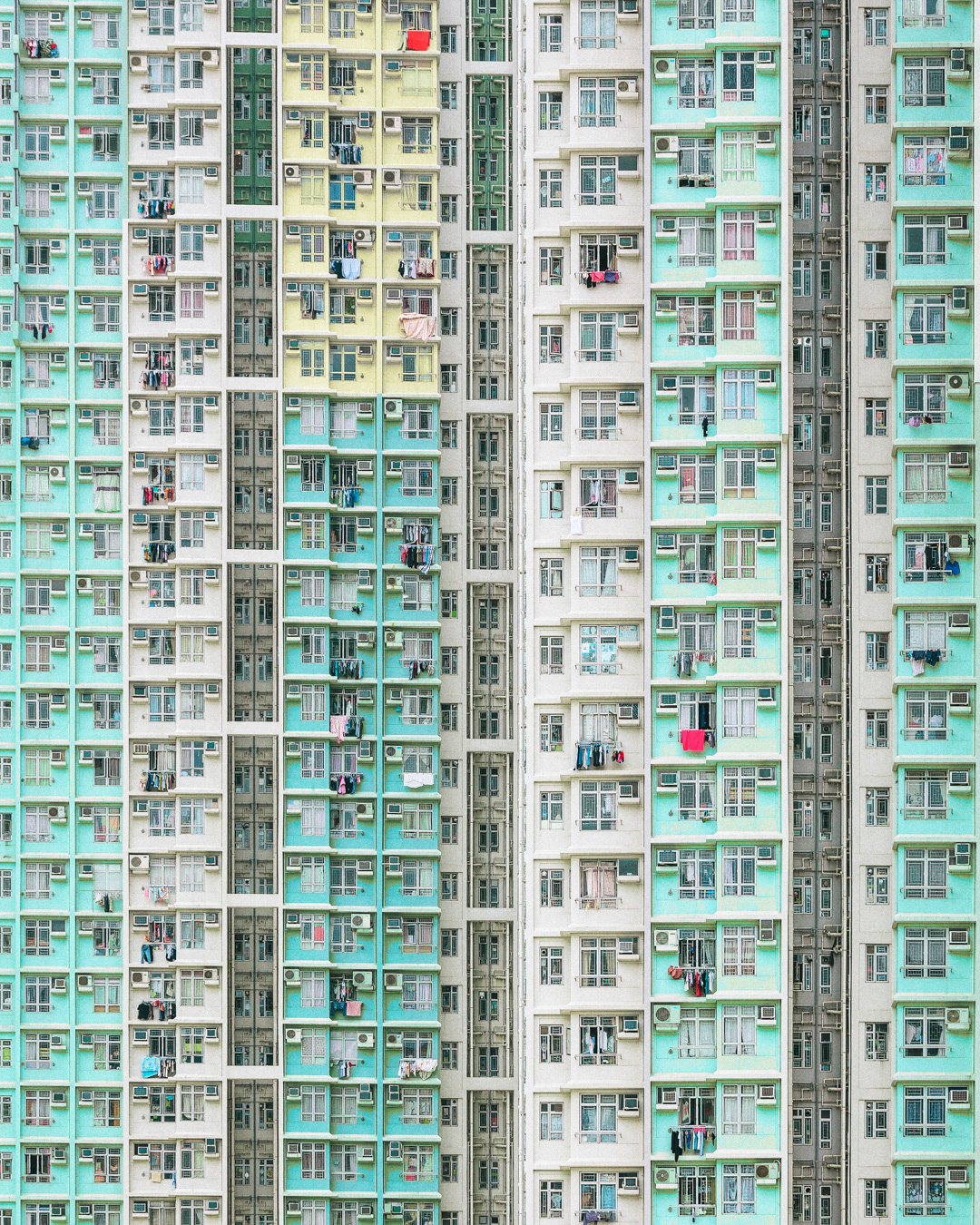 The vibrant, chaotic beauty of Hong Kong’s busy facades—dense layers of signage, air conditioners, laundry, and life stacked high across towering buildings. Each image reveals the city’s unique vertical rhythm, where urban density meets visual overload in a dynamic expression of daily life and architectural adaptation.