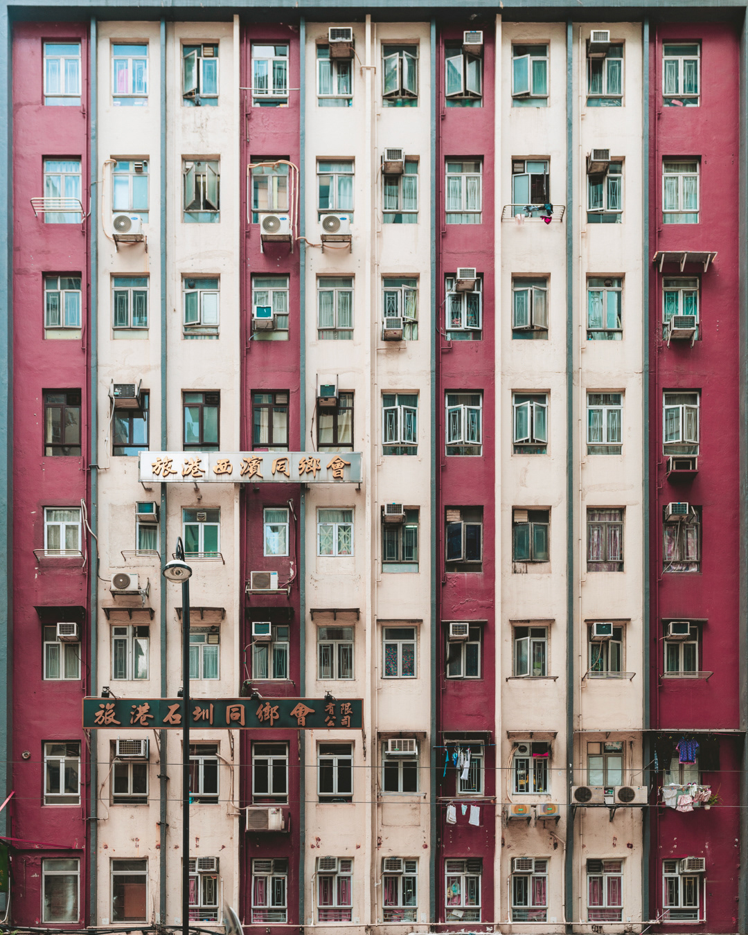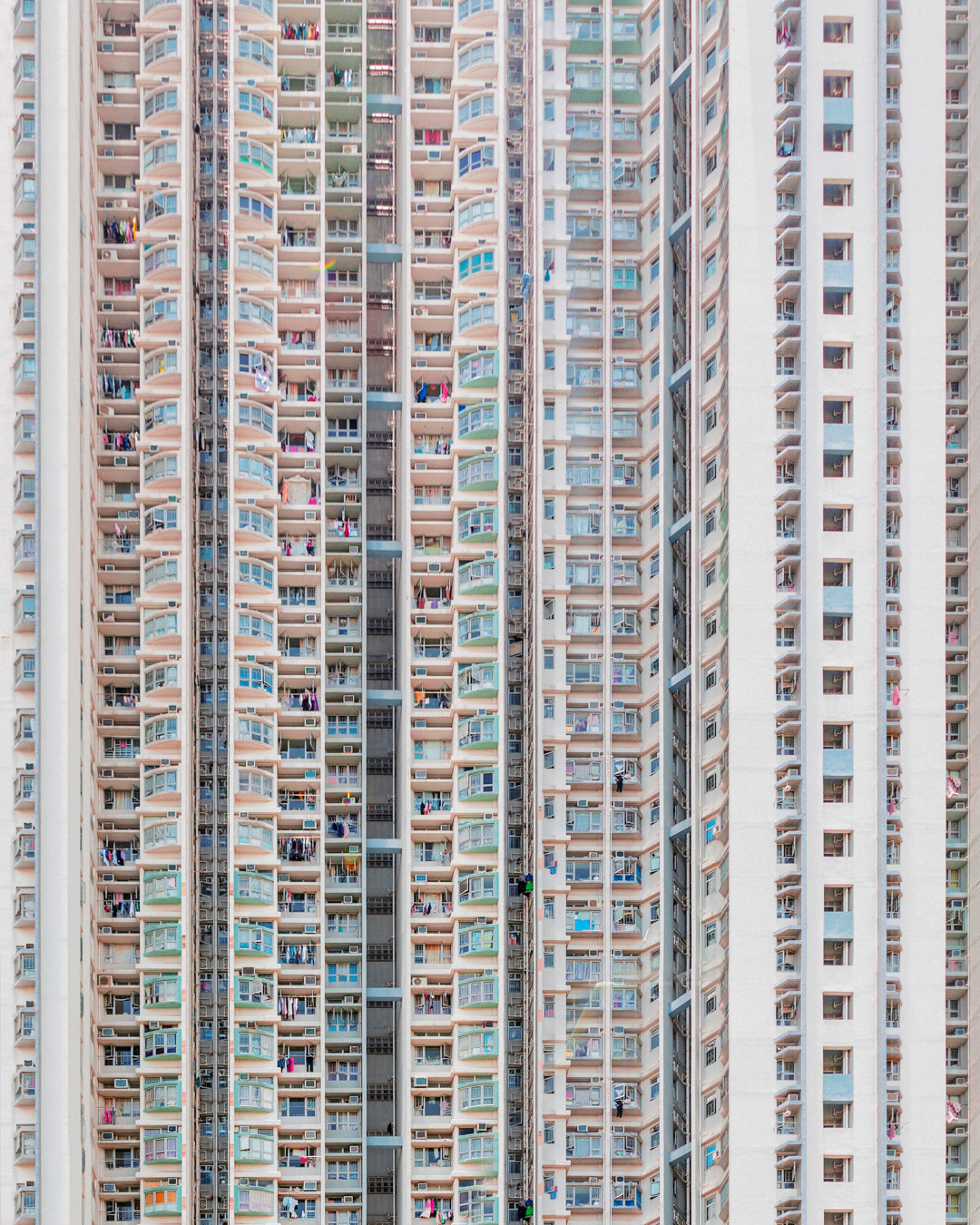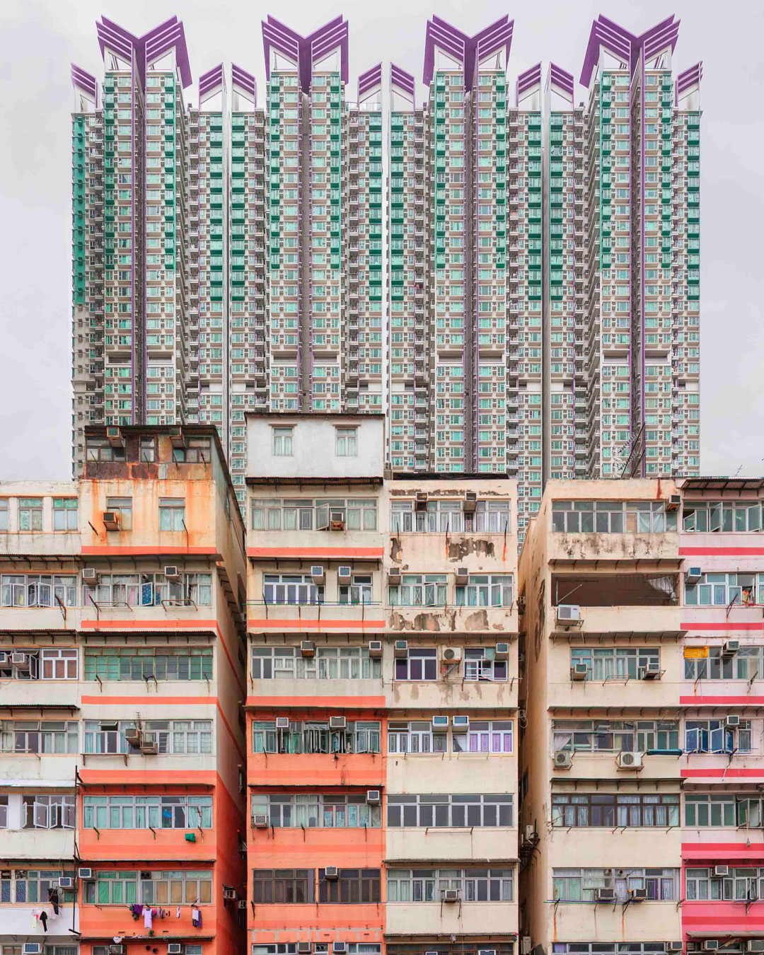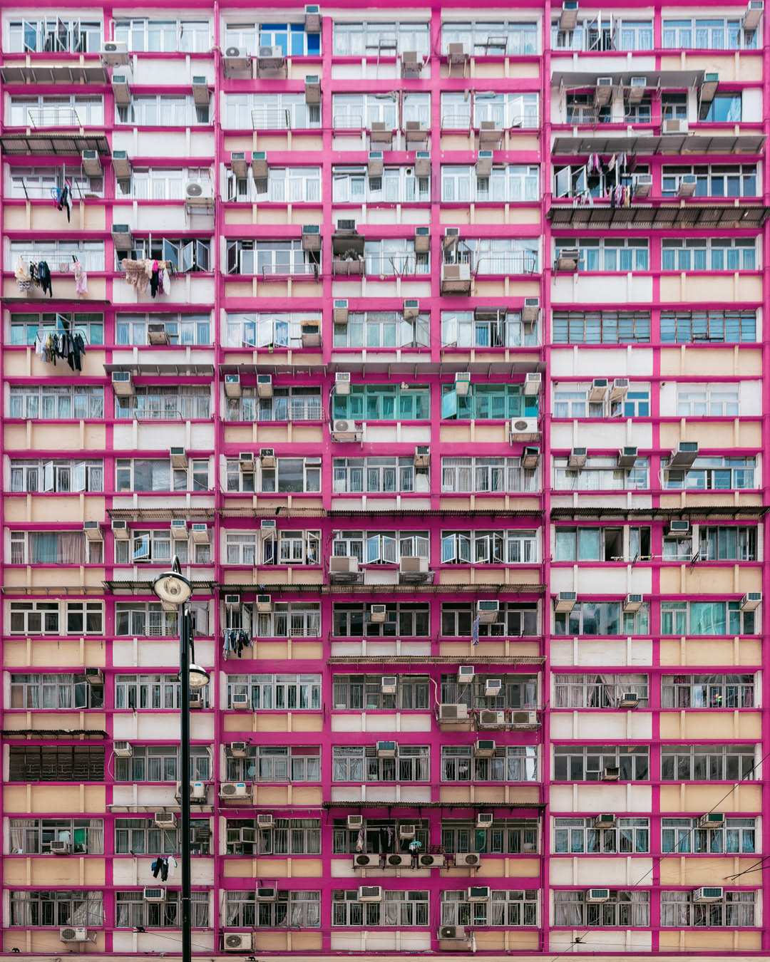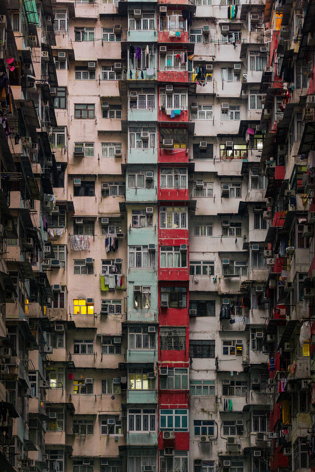 The vibrant, chaotic beauty of Hong Kong’s busy facades—dense layers of signage, air conditioners, laundry, and life stacked high across towering buildings. Each image reveals the city’s unique vertical rhythm, where urban density meets visual overload in a dynamic expression of daily life and architectural adaptation.