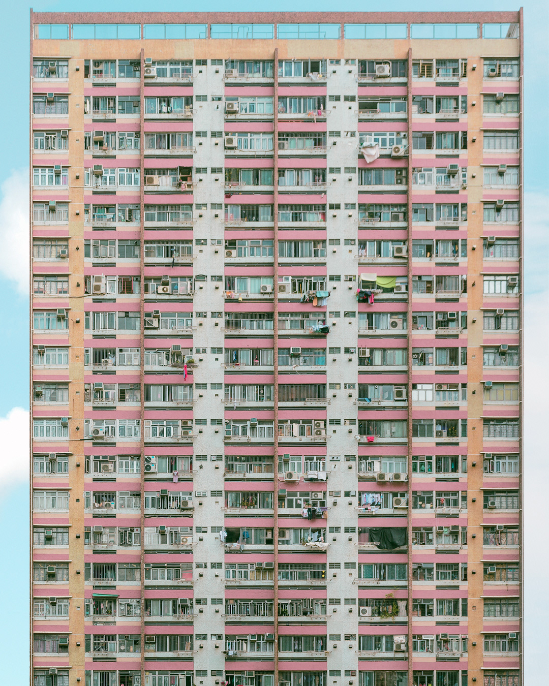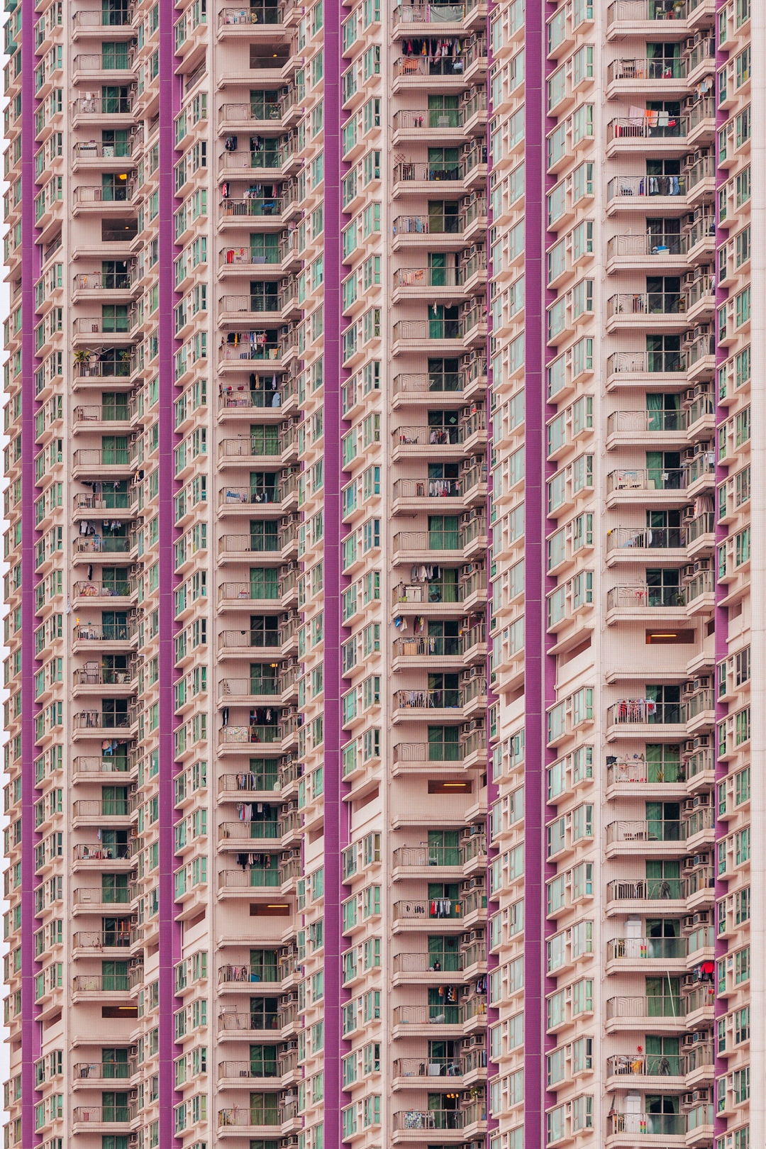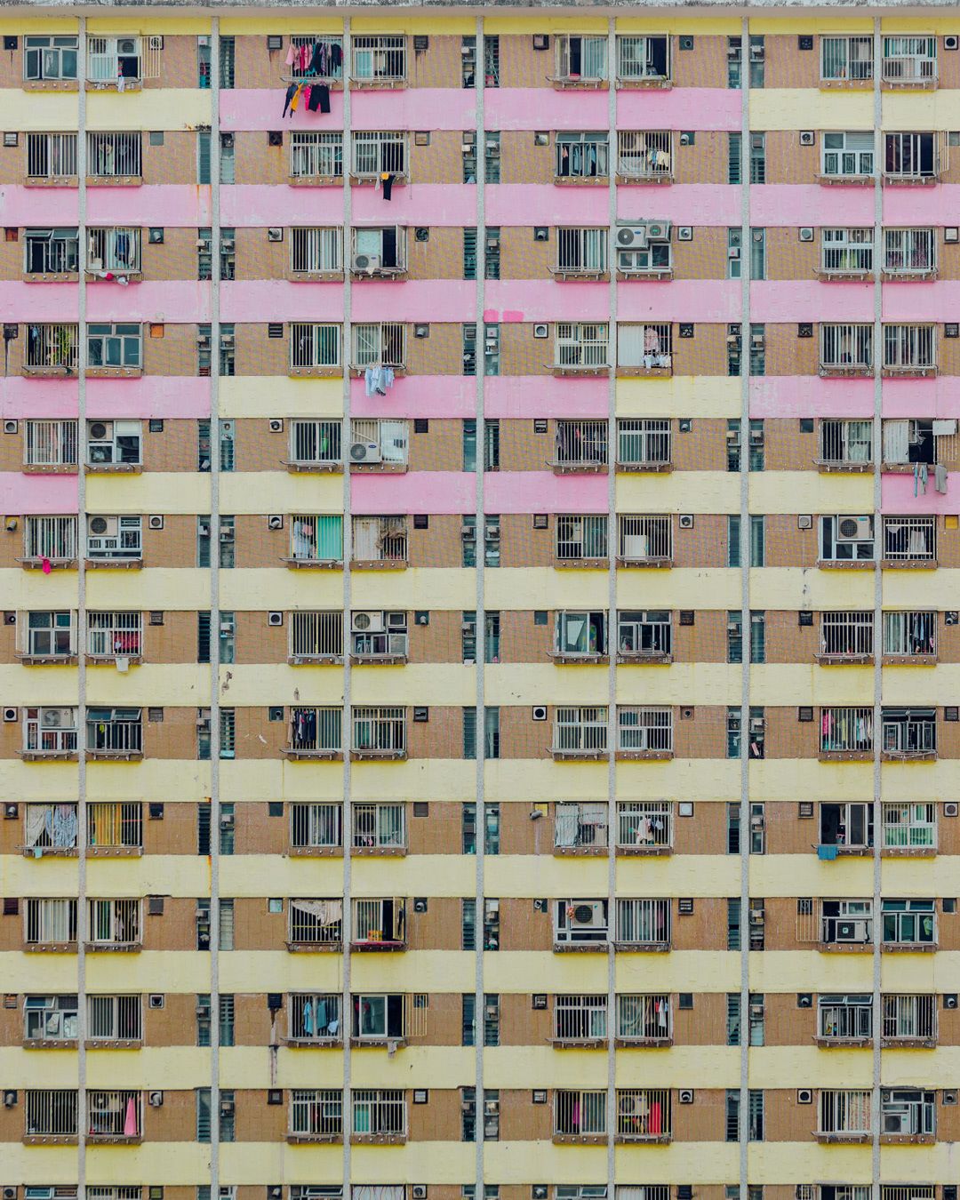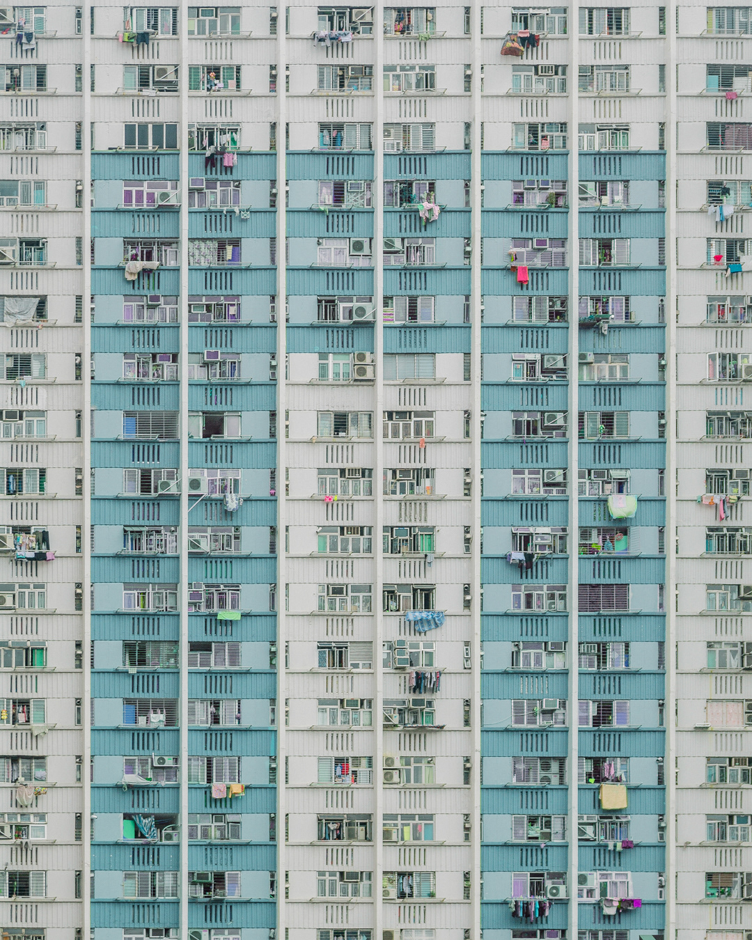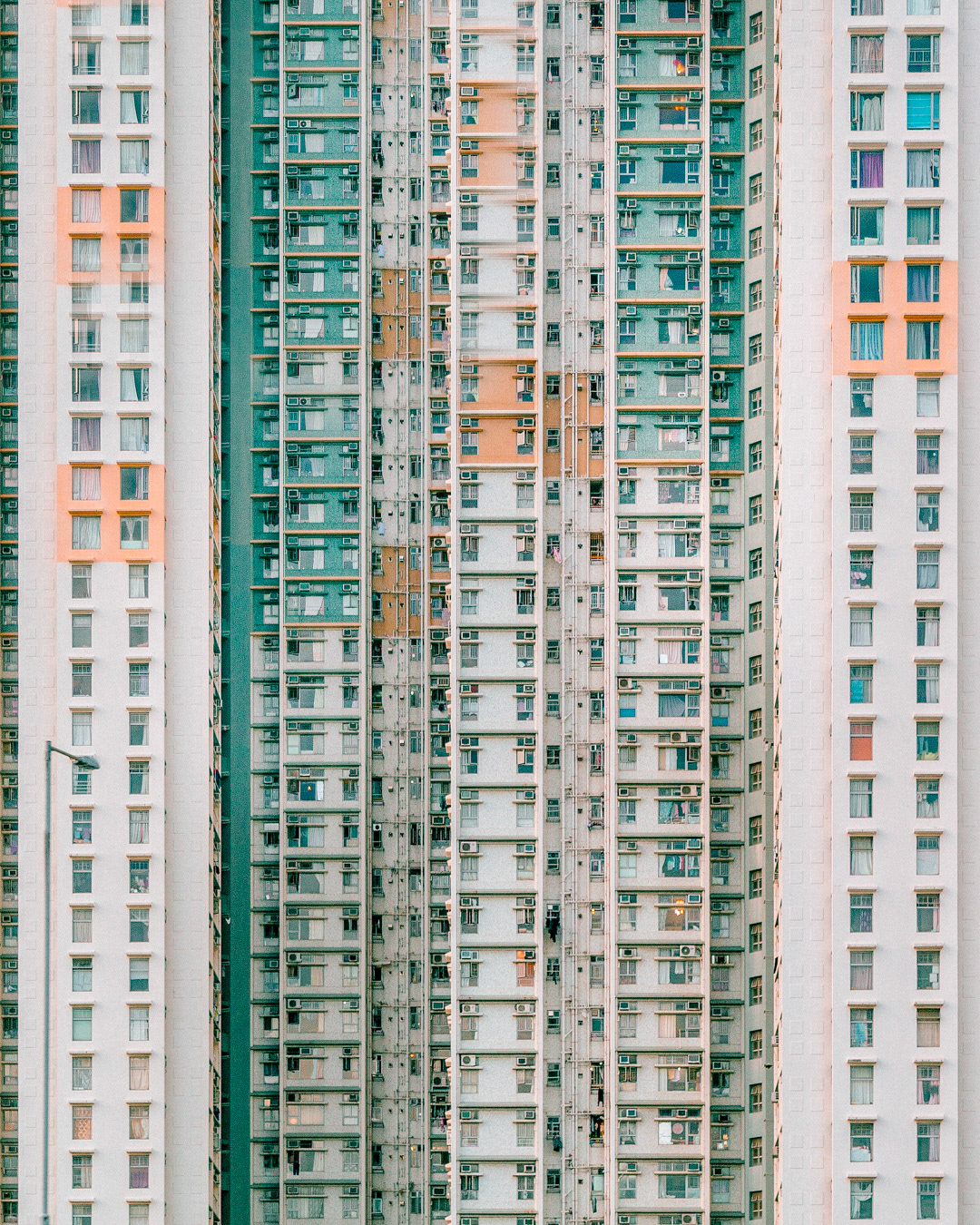 The vibrant, chaotic beauty of Hong Kong’s busy facades—dense layers of signage, air conditioners, laundry, and life stacked high across towering buildings. Each image reveals the city’s unique vertical rhythm, where urban density meets visual overload in a dynamic expression of daily life and architectural adaptation.