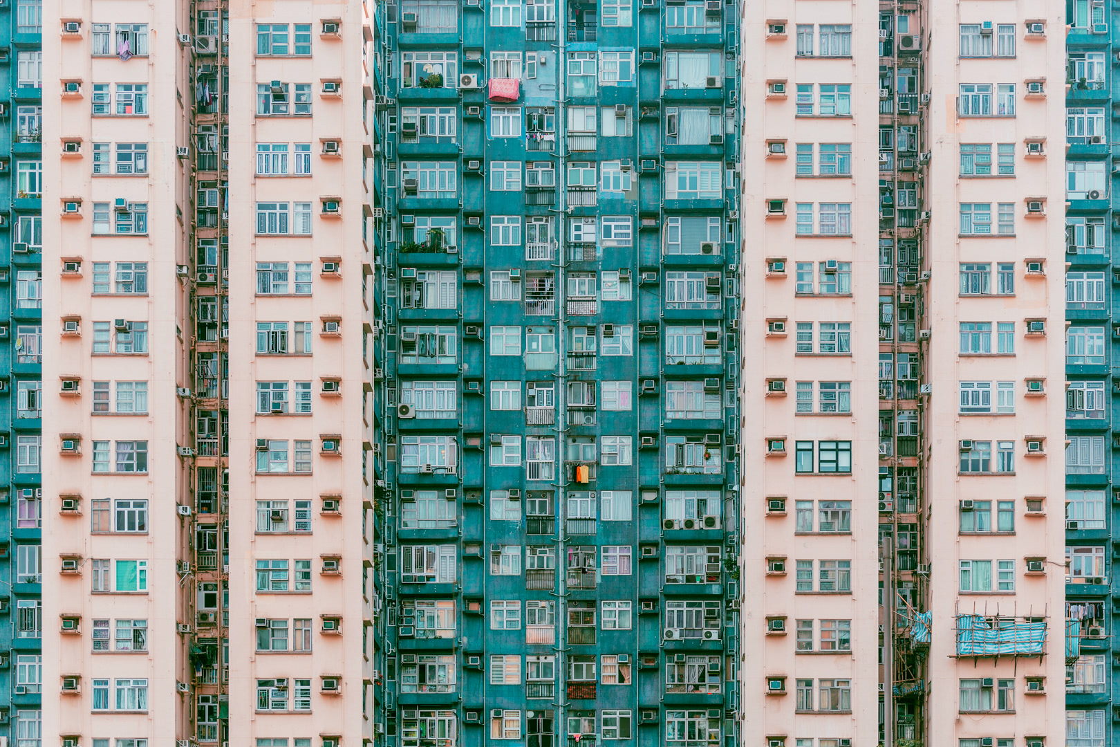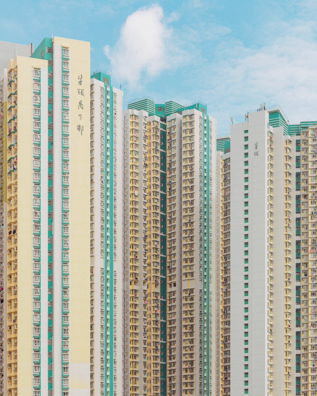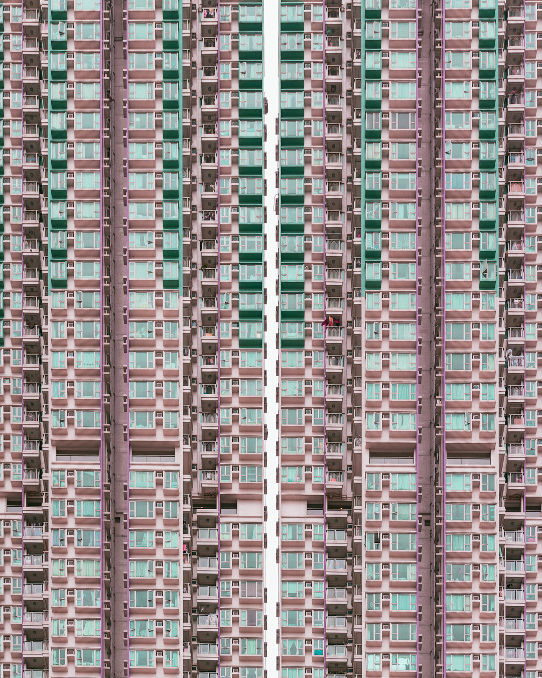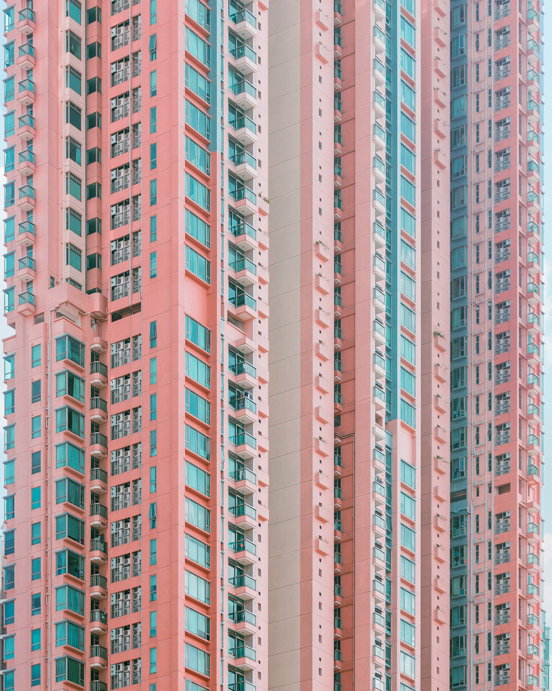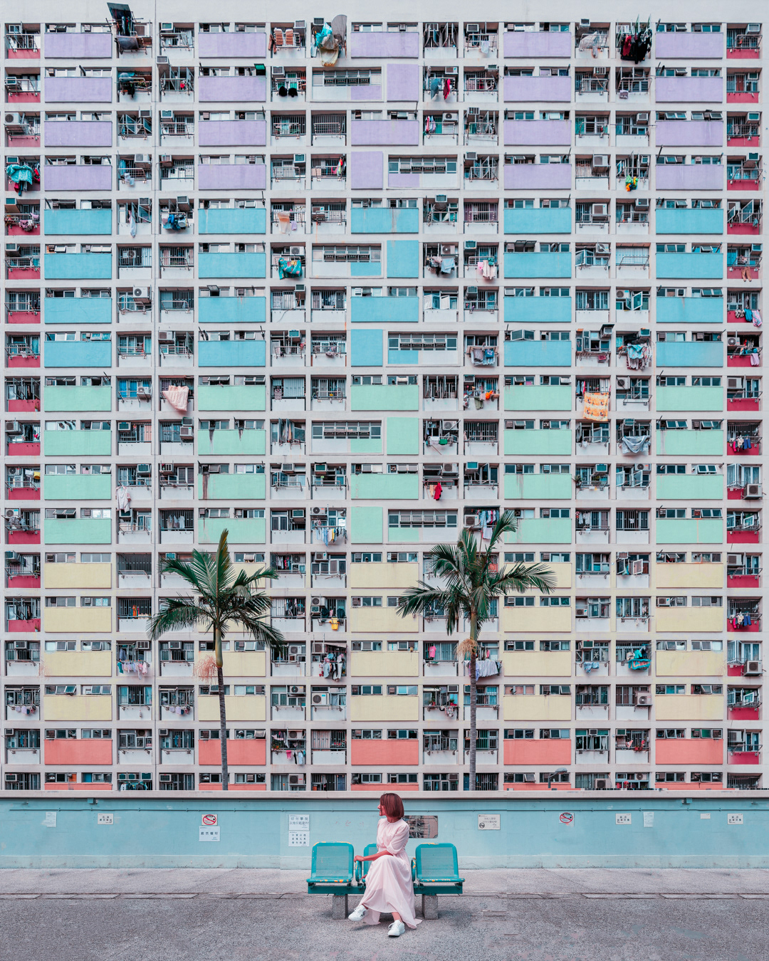 The vibrant, chaotic beauty of Hong Kong’s busy facades—dense layers of signage, air conditioners, laundry, and life stacked high across towering buildings. Each image reveals the city’s unique vertical rhythm, where urban density meets visual overload in a dynamic expression of daily life and architectural adaptation.